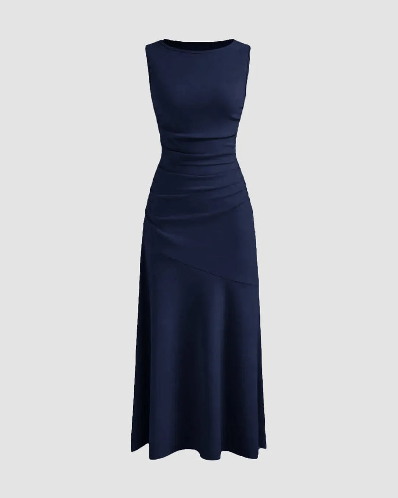 Boat Neck Solid Ruffle Ruched Dark Navy Maxi Dress