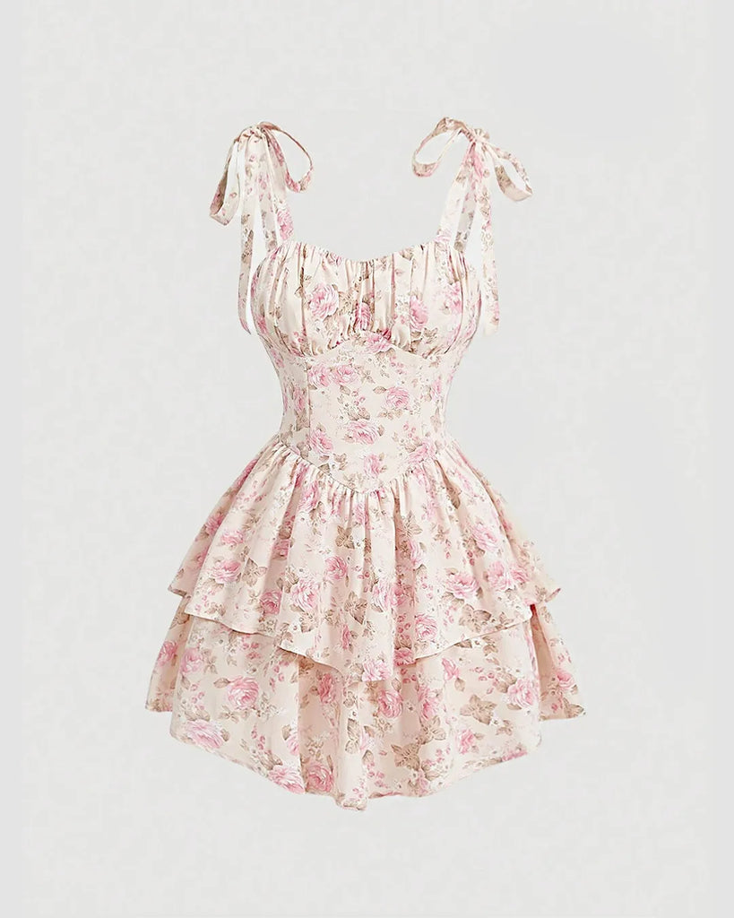This beautiful floral dress is a charming choice for any occasion. It features a flattering sweetheart neckline that highlights the décolletage, giving it a romantic, feminine look. The bust area is delicately ruched, adding texture and structure to the bodice. Instead of traditional straps, this dress has sweet shoulder ties that allow you to adjust the fit perfectly while adding an extra touch of dainty detail.